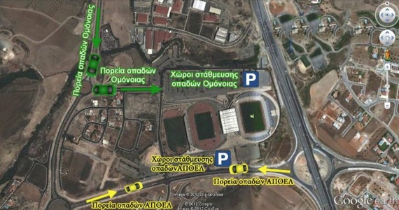 Οι φίλαθλοι της ΟΜΟΝΟΙΑΣ θα καταλάβουν τις Βόρειες Κερκίδες του Σταδίου. Ως εκ τούτου προτρέπονται οι οπαδοί που θα εισέλθουν στις πιο πάνω κερκίδες να κατευθυνθούν στο Στάδιο από τα φώτα ΟΡΦΑΝΙΔΗ και να σταθμεύσουν τα οχήματα τους στους Βόρειους χώρους στάθμευσης.